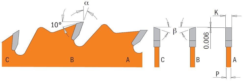 - 0.098 kerf thickness, 0.071 plate thickness, 20º Hook Angle, 1 Flat + 2/15º alternate teeth Grind.